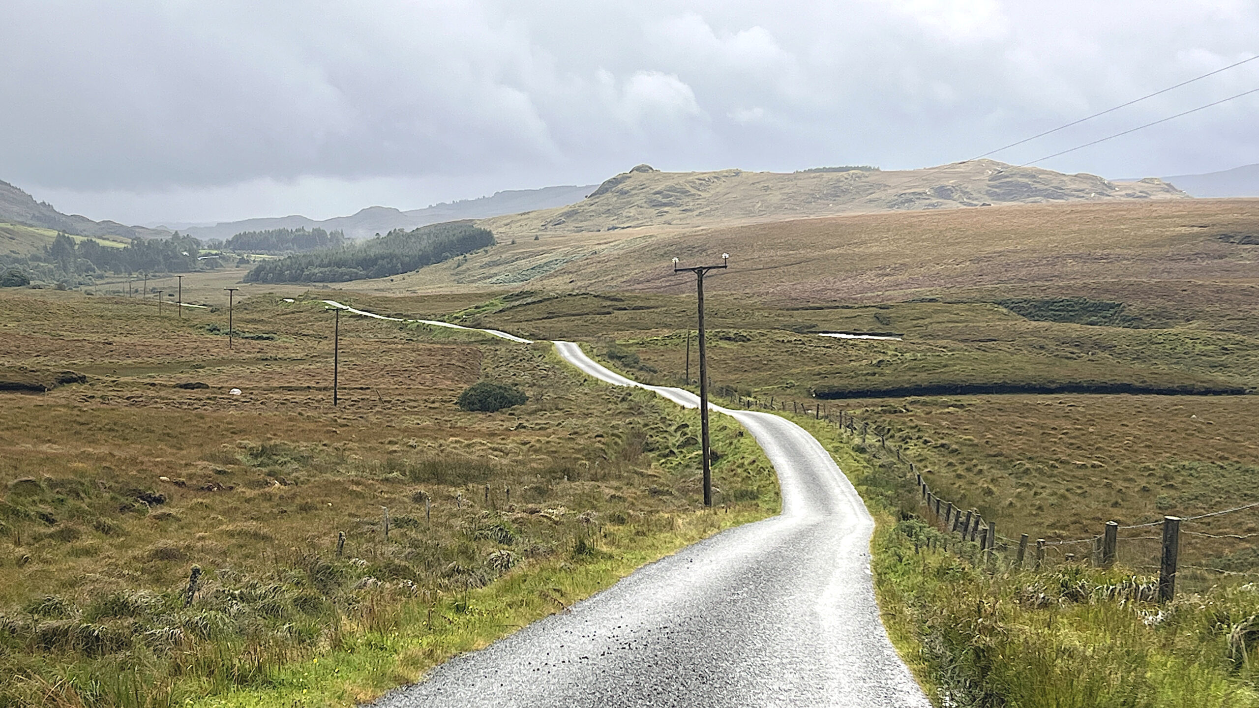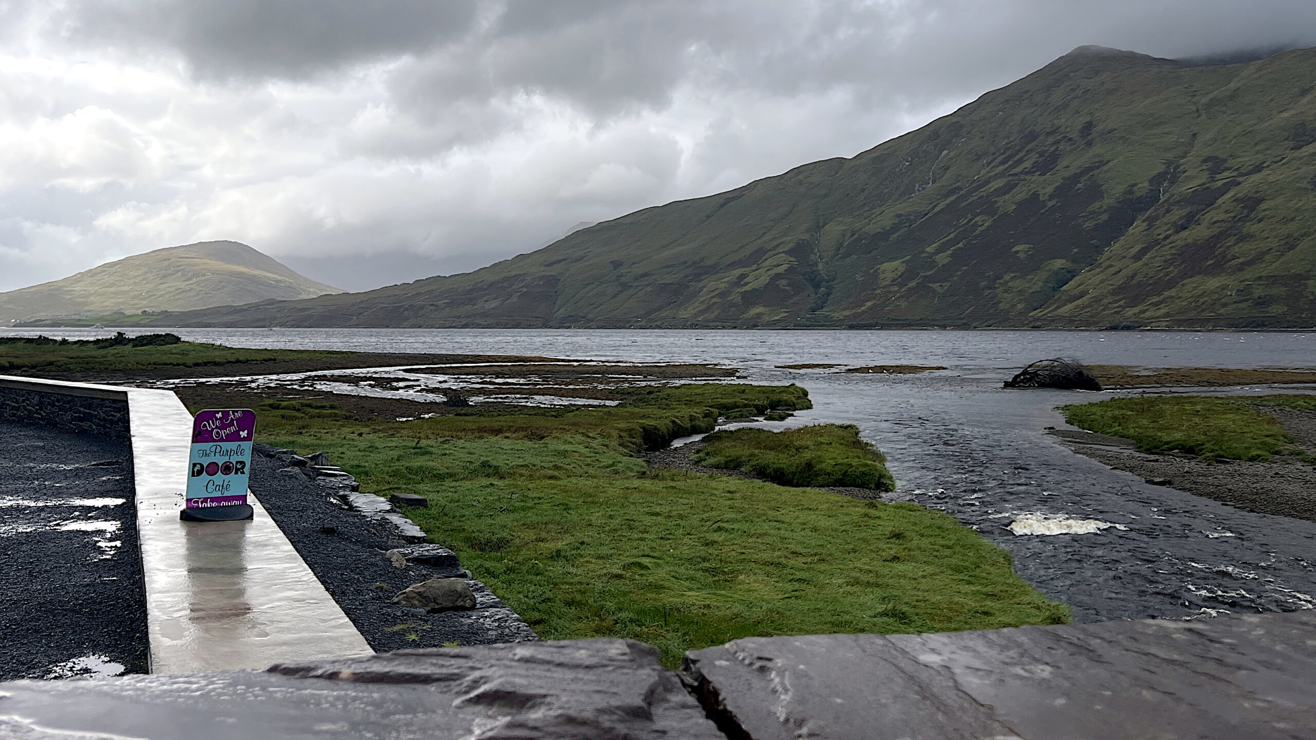 It was wonderful: no people, vast empty landscapes, and lots of lakes. On the other side of the peninsula, I stayed on the N57, which was very quiet here—perhaps because of the weather. Then I headed down to Killary Fjord, a popular destination—just not in this weather. In Leenaun, I finally found shelter and was able to take a short break. Needless to say, I preferred to stay on the N57 rather than cycle against the wind again.