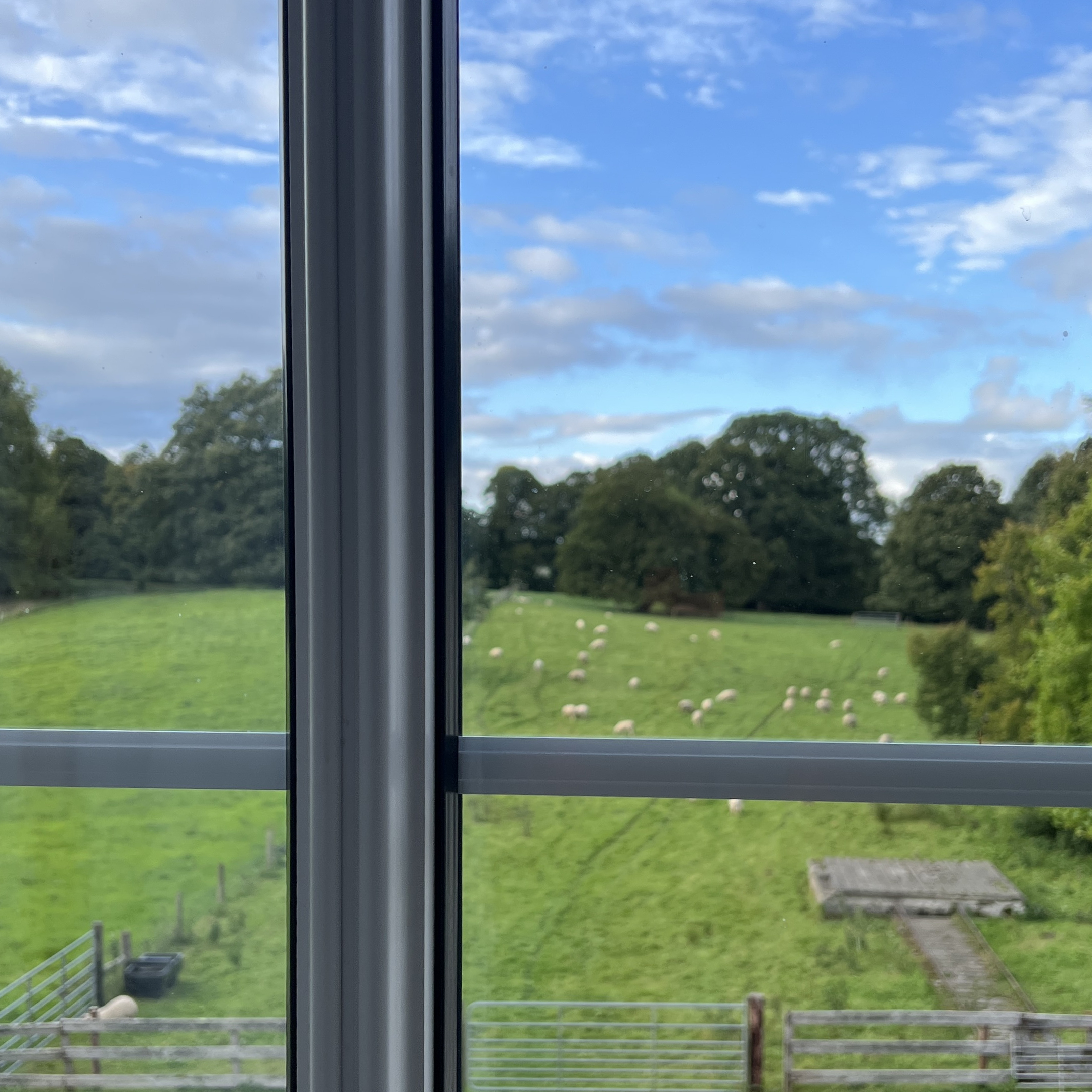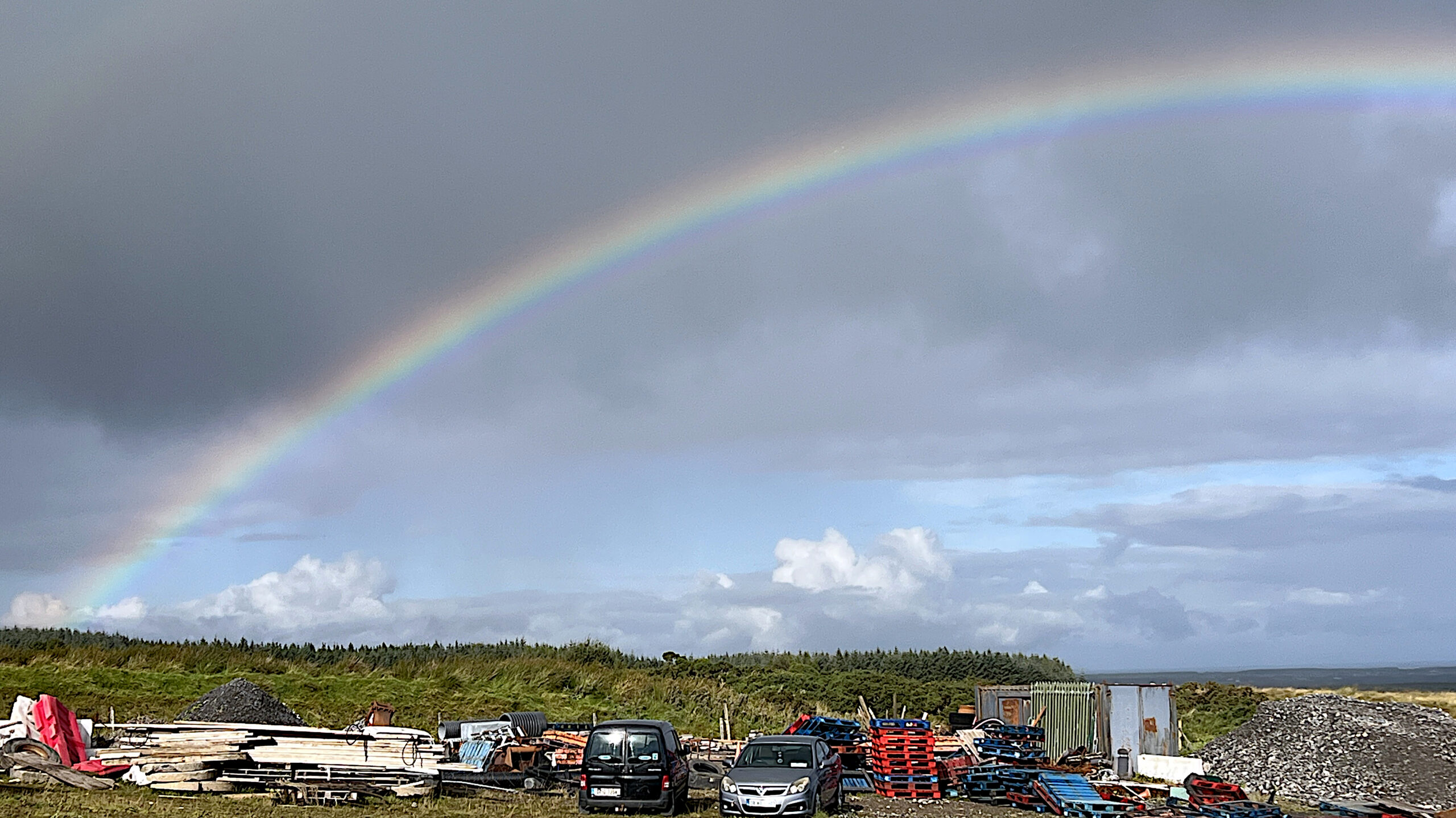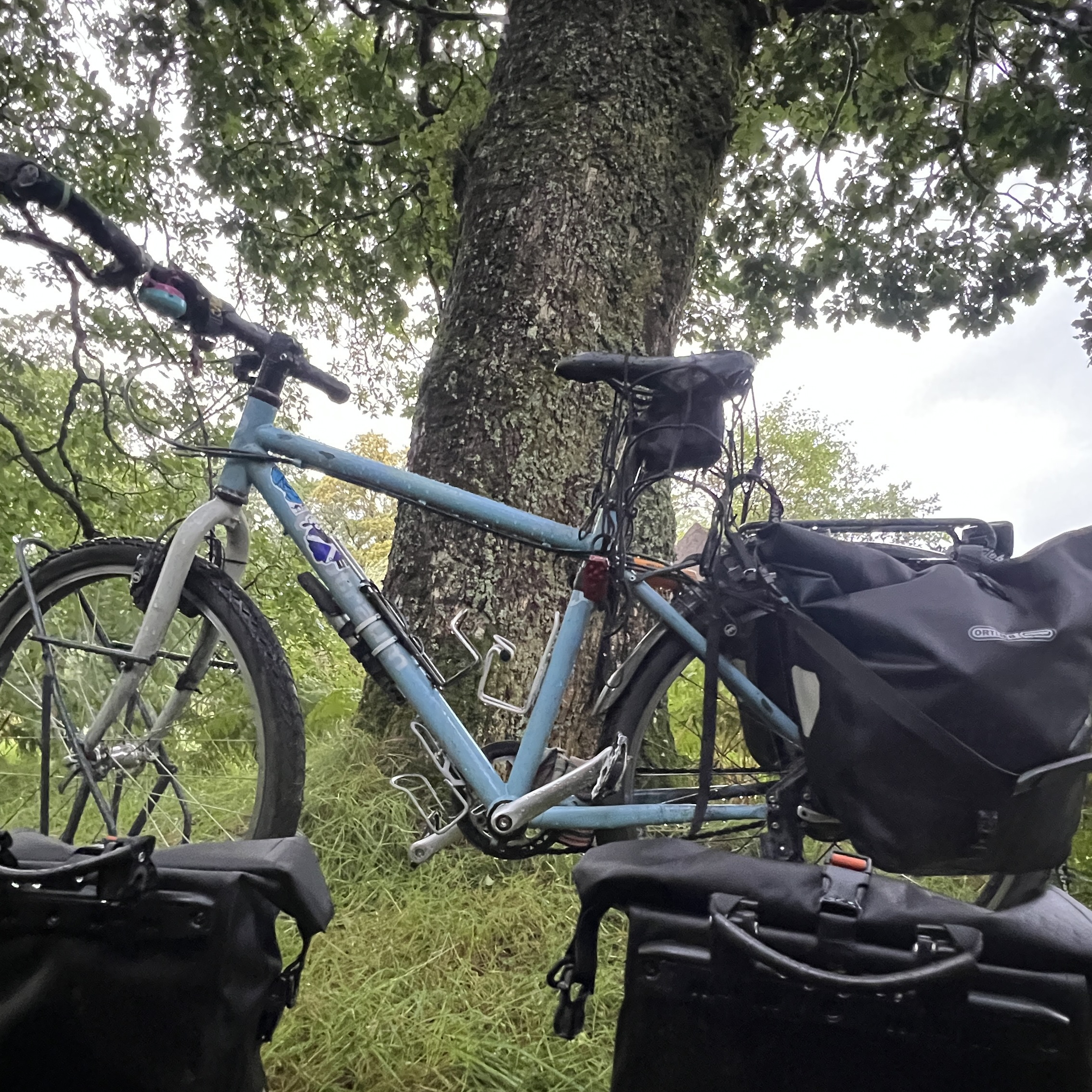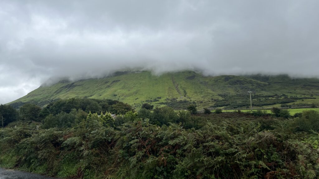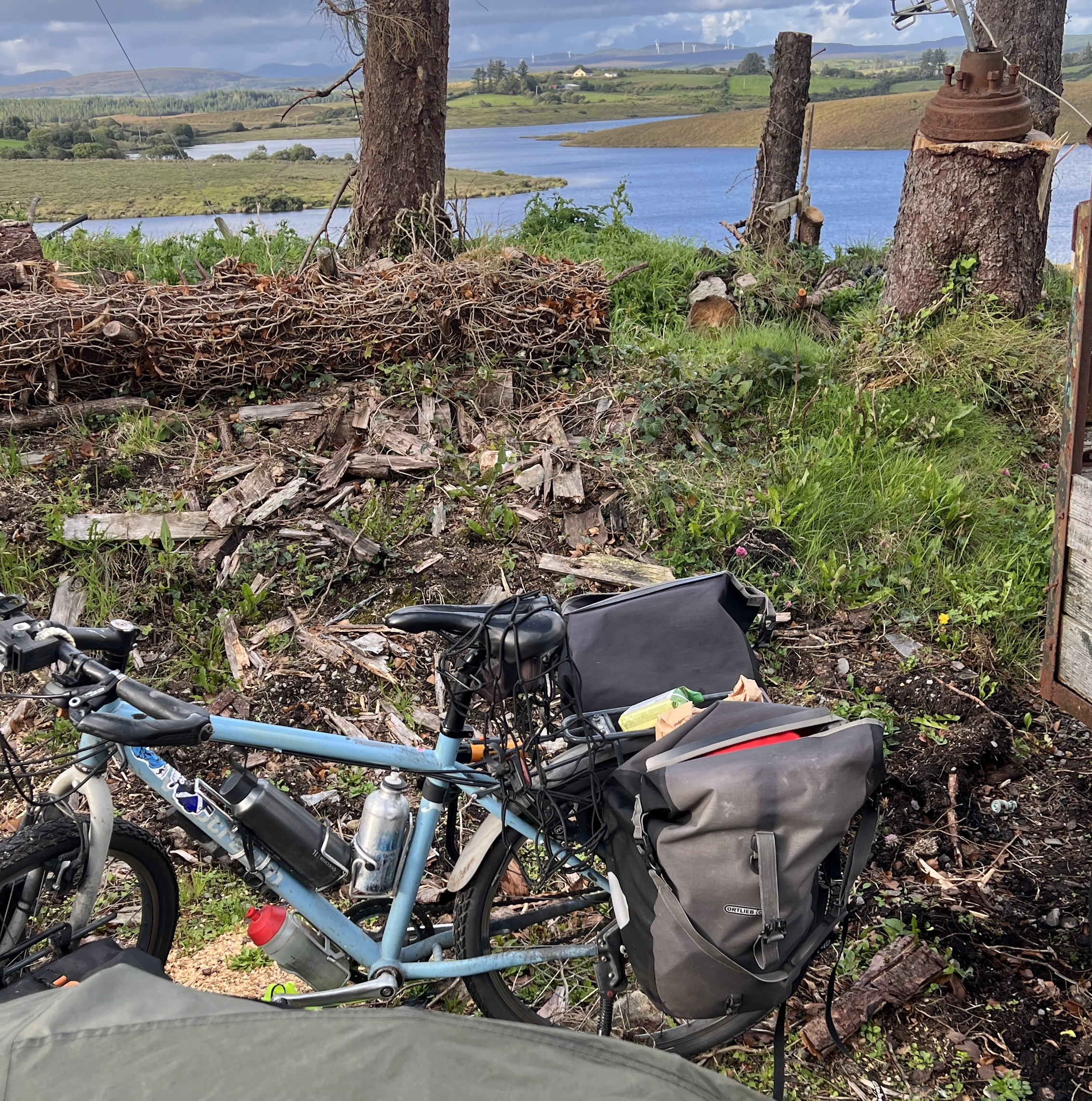 I couldn’t get past one owner who was cutting his hedge. Within a very short time, he told me his whole life story. However, he didn’t know where I could pitch my tent – even though he had a large garden 😉! It was still early, so I cycled on. I was getting closer and closer to the border with Northern Ireland. I didn’t want to camp wild there. It was wonderfully quiet along the border. There was nothing going on at all. Finally, I was able to camp at a lonely farmhouse on a hill with a great view. There had been a severe storm here in January/February 2025. On the way, I had seen trees that had been knocked over again and again. Here, they had to cut down two trees. I slept softly on sawdust.