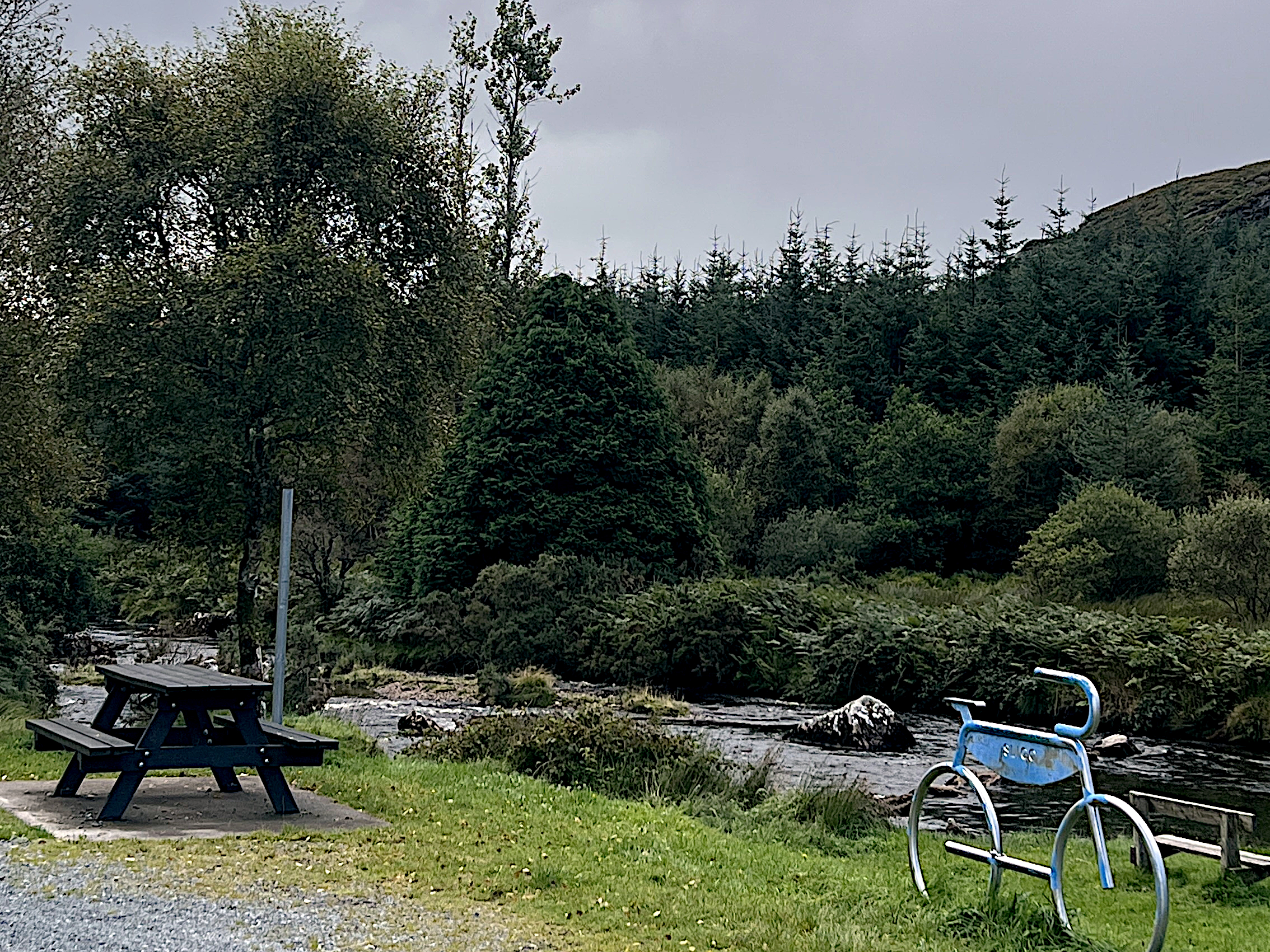 I found a shelter in a small forest where I could pitch my tent – once again, camping in the wild. The next day was also rainy and windy. First, I cycled to Westport for a coffee – a ritual I had now developed. Then I took a short greenway to Newport. This time, I accepted having to cycle between fences because the road was unpleasant.